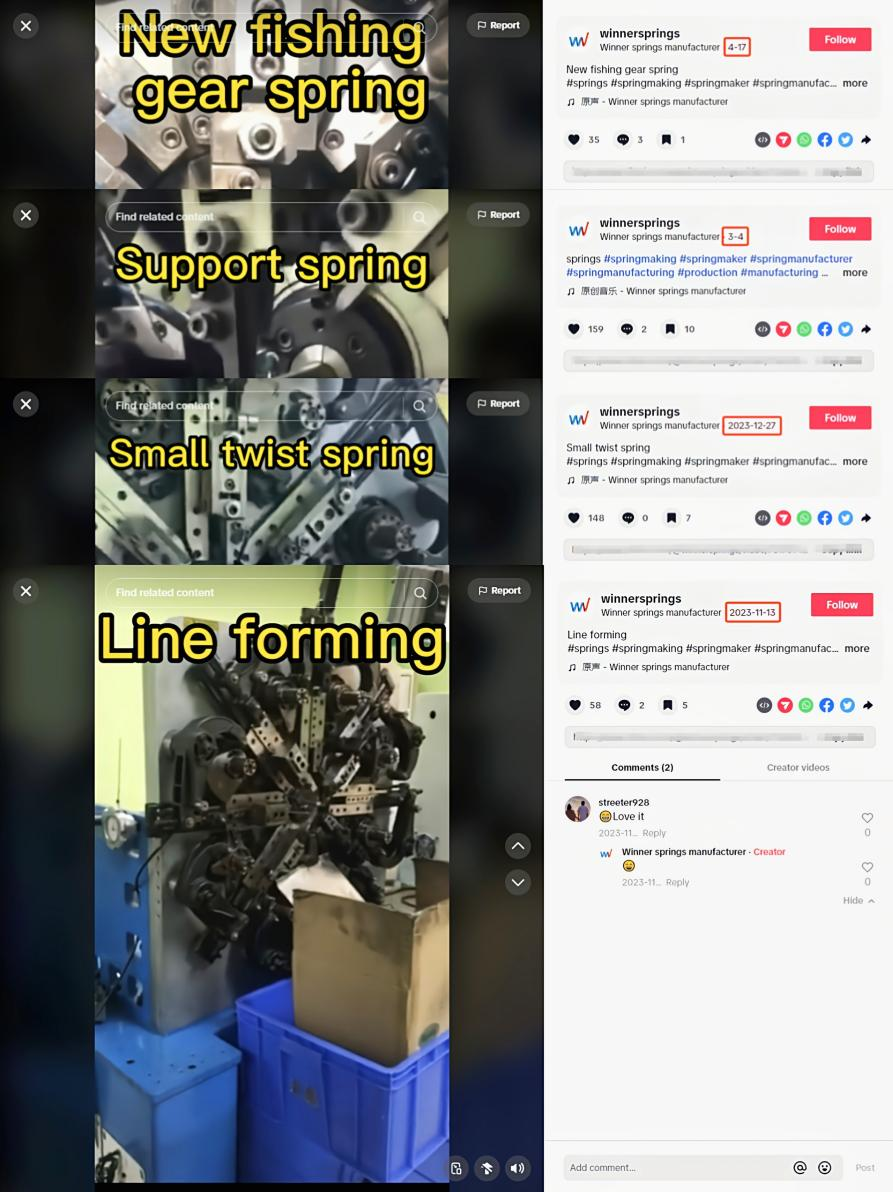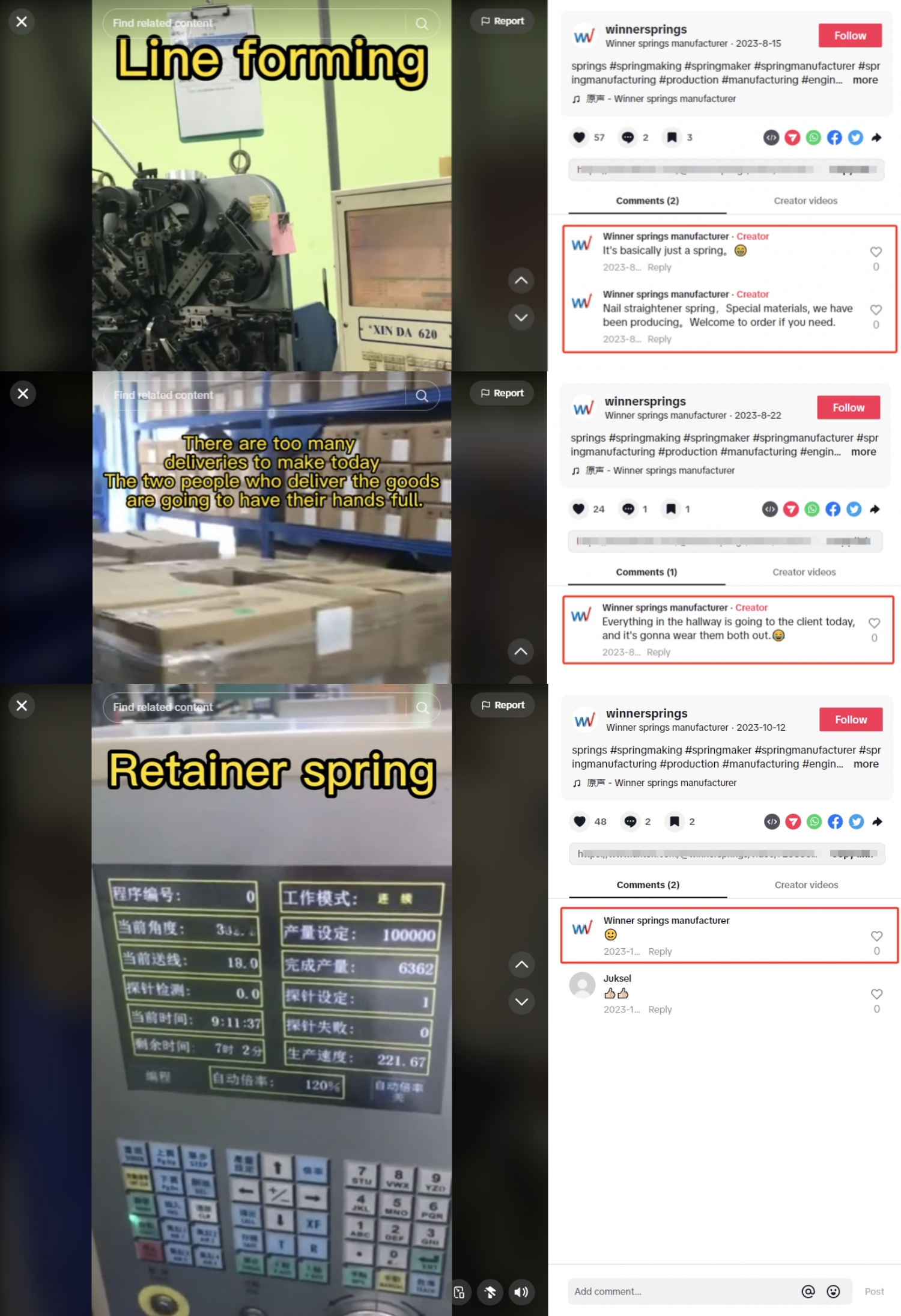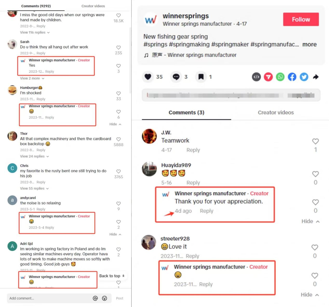 也值得一提的是,该弹簧工厂会在评论区进行引导,即便没有人评论,很多时候也会自己做一个引导的动作,这样做的好处有很多,比如可以让用户感到更加亲切,再比如可以吸引留言或者询盘,是大家在布局TikTok时,很值得参考的点。