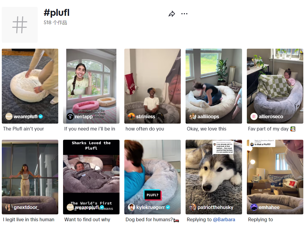 TikTok上还有不少用户为爱发电为这款狗窝打call,品牌标签#plufl已有超过500多个作品、千万次浏览量。