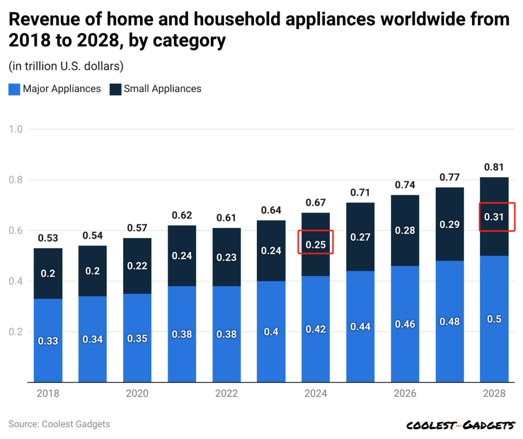 随着全球消费需求的提升和小家电产品的不断升级,小家电以其小巧、免安装、价格实惠等优势,迅速成为家电市场的新宠。根据Statista的预测,2024年全球小家电市场规模将达到2543亿美元,并在2028年增至3100亿美元。厨房小家电,如电饭煲和多功能料理机等产品,正日益成为市场的重要组成部分。