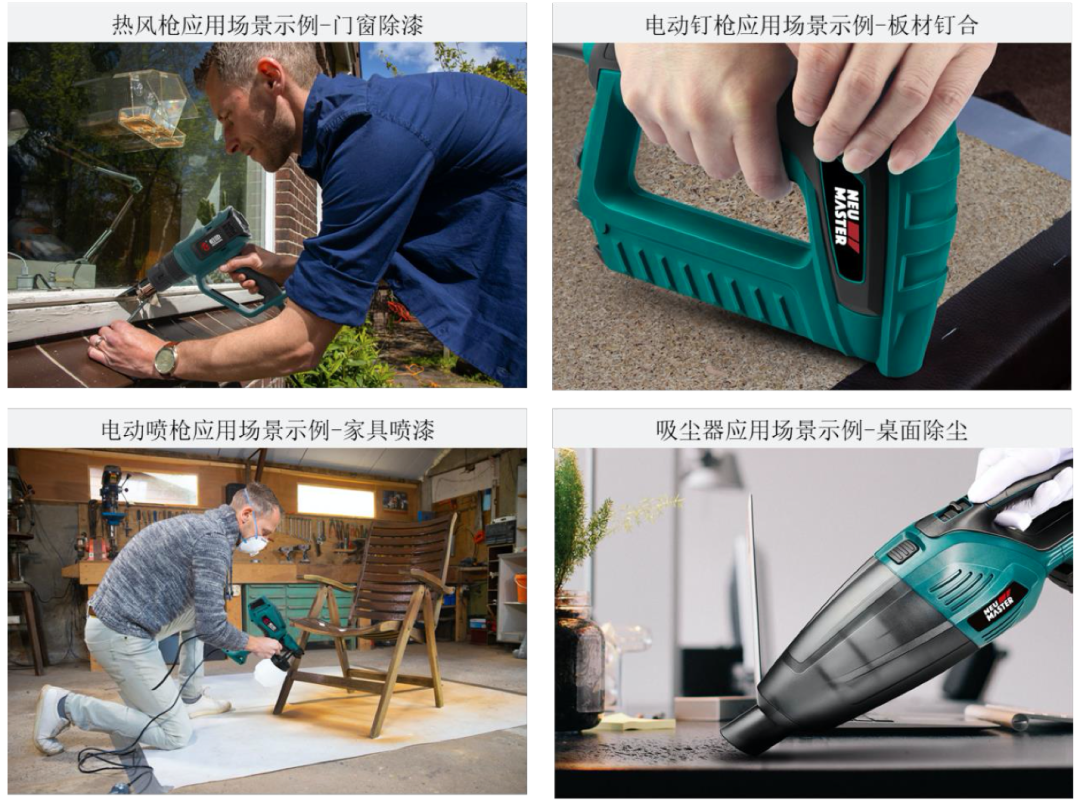 通过涵盖电热类、喷涂类、钉枪类、吹吸类、冲磨类、蒸汽类等六大品类的产品矩阵,满足家庭装修、工业制造、建筑施工和园林维护等多个领域的需求。