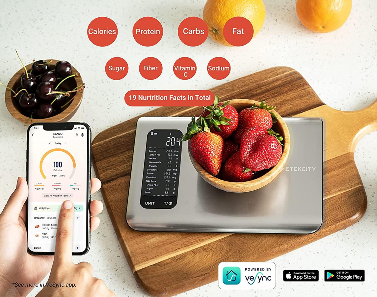 Etekcity的智能营养秤不仅仅是一款简单的称重工具,它是一款专门为健康管理设计的智能设备。采用食品级不锈钢平台和高精度传感器,确保称重的准确性和可靠性。此外,其轻薄紧凑的设计提高了便携性和易用性。