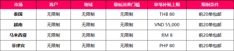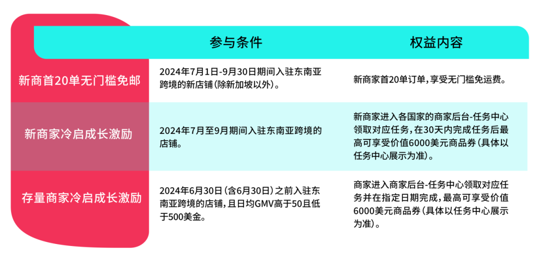 从2024年7月1日至9月30日,新入驻的东南亚跨境店铺(除新加坡外)可享受首20单免运费。买家通过短视频、直播间和橱窗领取运费券,订单支付时自动生效,有效期当天。