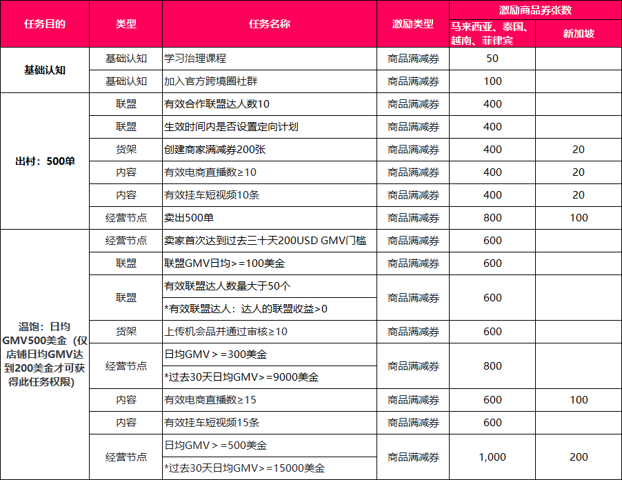 2024年6月30日及之前入驻且最近30天GMV(商品交易总额)高于1500美元且低于15000美元的店铺,可享受最高5000美元的商品券激励,任务完成后发放,券有效期为7个自然日。