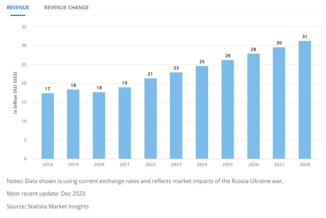 根据Statista的数据,2023年全球渔具市场的收入达到了230亿美元,预计到2028年,这一数字将增长至310亿美元,年复合增长率为6.15%。