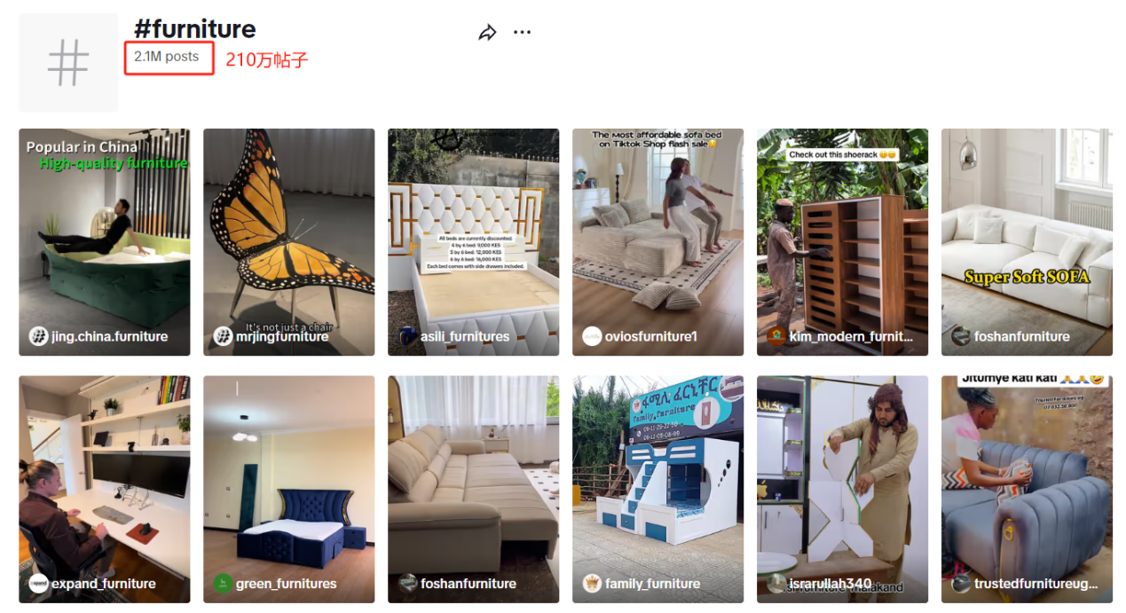 TikTok上搜索#furniture,有210万的帖子都是这个内容,为国内想要出海的家居家具工厂提供了巨大商机。
