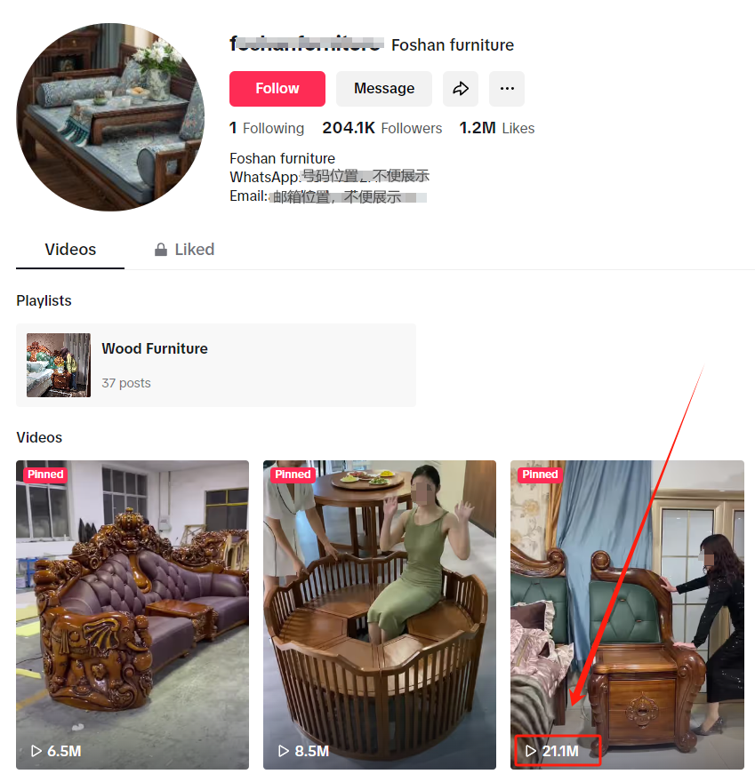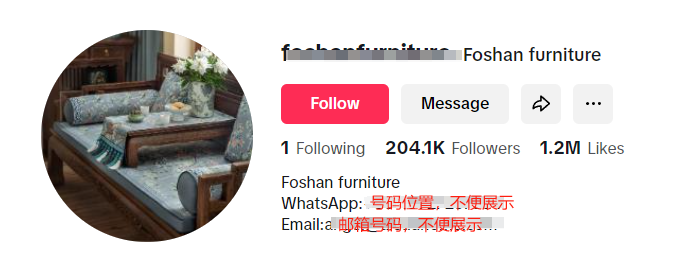 需要注意的是,这家佛山家具工厂,也在利用了“主页添加链接功能”来促进商品转化,能够看到,在其TikTok账号主页上,同时挂载了WhatsApp的联络方式和Email邮箱的联络方式。这样当有客户想要购买其产品时,便可以快速联系到他们,可以有效避免客户流失,提高了销售转化率。