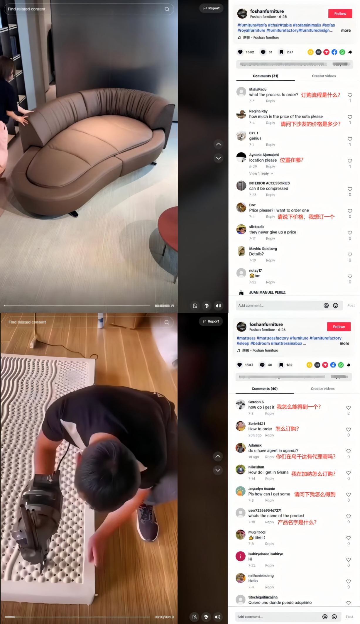 另外,在内容形式上,这家佛山家具工厂也会展示一些家具的制作过程,这种类型的视频,在增加用户对产品的信任感有较好的效果,亲眼看到了一款家具是如何做出来的,那在购买时也就更加地放心。相信这也是为什么许多用户在看过他们的视频后,纷纷在评论区留言求购的原因之一。