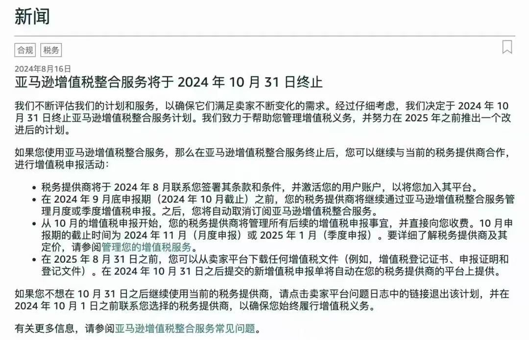 亚马逊将于2024年10月31日终止增值税整合服务。正在使用亚马逊增值税服务管理欧洲税务的卖家们,须寻找其他税务合规服务提供商接管VAT税号。其目前已不再接受新卖家加入其增值税整合服务。销售旺季即将来临,建议尽快完成相关操作以避免对销售产生任何影响。