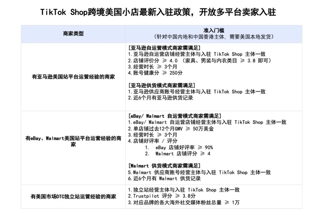 1.TikTok美区ACCU店门槛降低:TikTok最近降低了美区ACCU店的入驻门槛,经营主体要求:亚马逊自运营店铺的经营主体必须为美国主体,且与入驻TikTok的主体一致。股权要求:美国主体的中国国籍最终受益人持股比例需≥25%。店铺评价分:需≥4.0(家具、男装与内衣类目≥3.8)。经营时长:店铺经营时间需≥3个月。账号健康分:需≥250分。