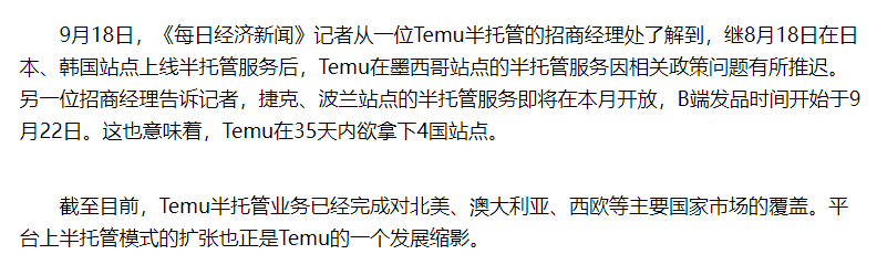 1.Temu半托管两站点即将上线:TEMU平台即将在捷克和波兰市场推出半托管服务,为卖家带来新的增长机遇。捷克站预计于9月29日上线;波兰站则计划在10月6日开站;商家可以在9月22日开始发布产品。