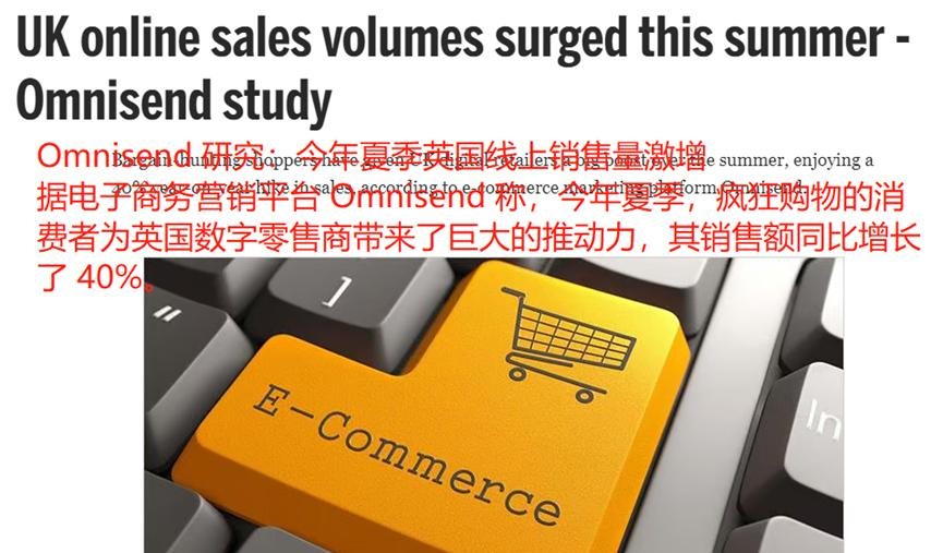 1.英国电商夏季销售额大涨40%:研究指出,今年夏季英国消费者购物热情高涨,推动了该国在线零售商业绩的增长。数据显示,今年6一8月,该平台的电商销售额同比大涨了40%,达到了总计4000万英镑,销售量更是增加了23.7万件。
