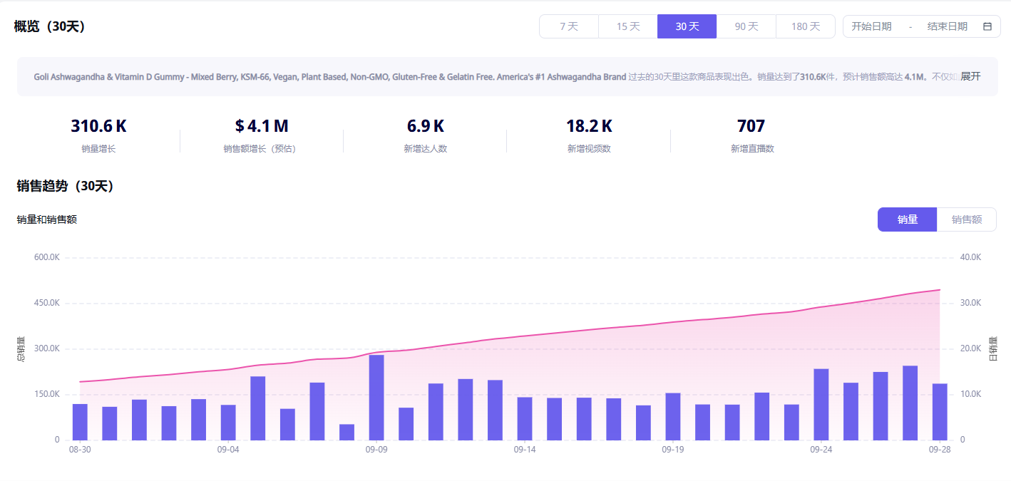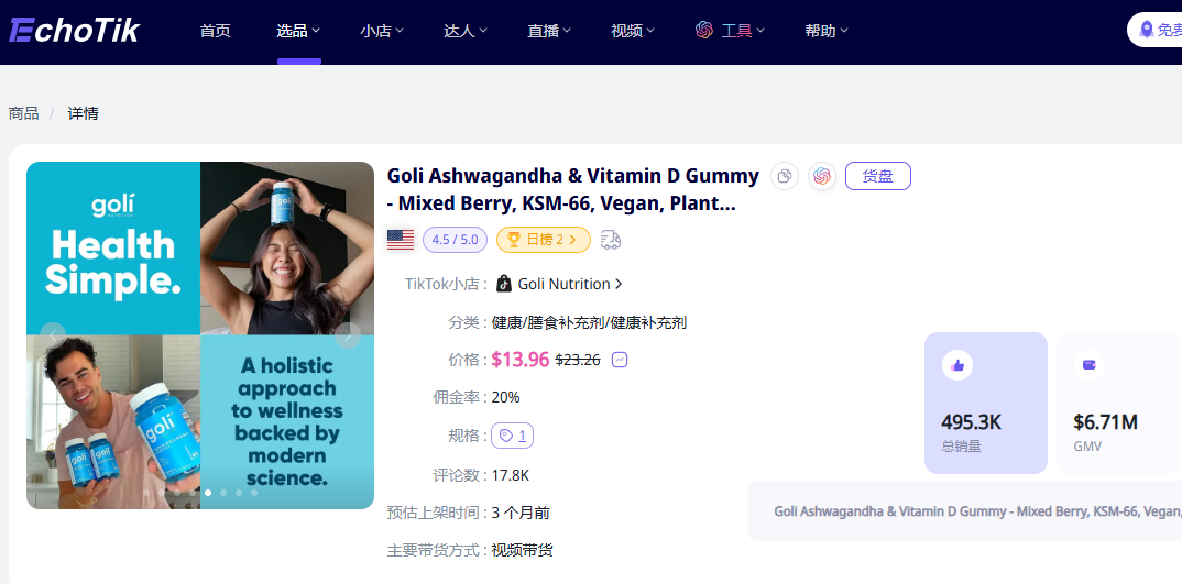 在TikTok美区,保健品的热度更是持续高涨。一款名为“Goli Nutrition”的维生素软糖,凭借其蕴含的大量南非醉茄,以缓解压力、促进放松、提高睡眠质量等功效,吸引了众多消费者的目光。