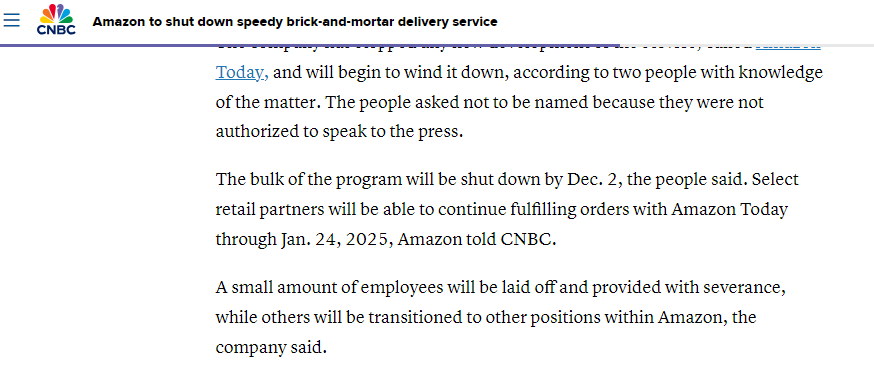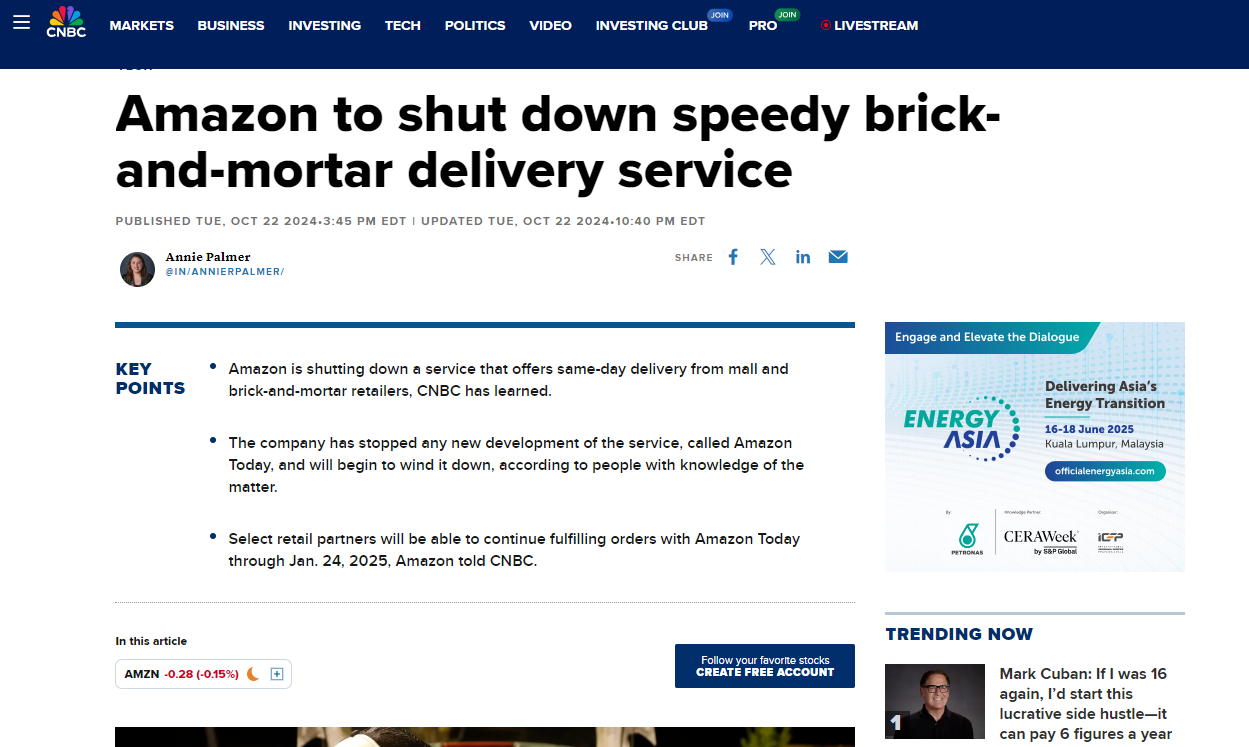 在电子商务的浪潮中,亚马逊一直是行业的领头羊,以其创新和快速的配送服务赢得了全球消费者的青睐。然而,随着市场环境的变化和成本压力的增加,即使是这样的巨头也不得不做出战略调整。根据最新消息了解,亚马逊宣布将关闭其为实体零售合作伙伴提供的当日送达服务——Amazon Today,这一决定迅速在业界引起了轩然大波,标志着亚马逊在快速配送领域的一次重大调整。