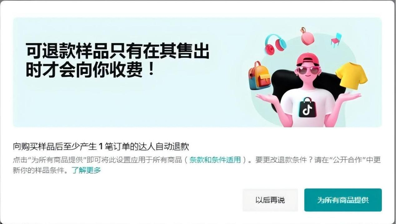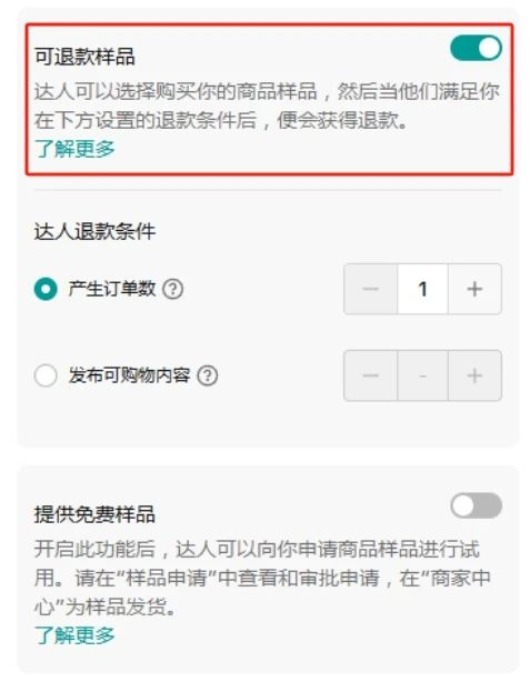 在联盟中心,商家可以选择“可退款”样品,或是直接提供“免费样品”。如选择“可退款”选项,达人收到样品后若未完成合作要求,商家可收取样品费用。这一机制减少了无故赠送样品的风险,让商家能够更安全地进行合作。