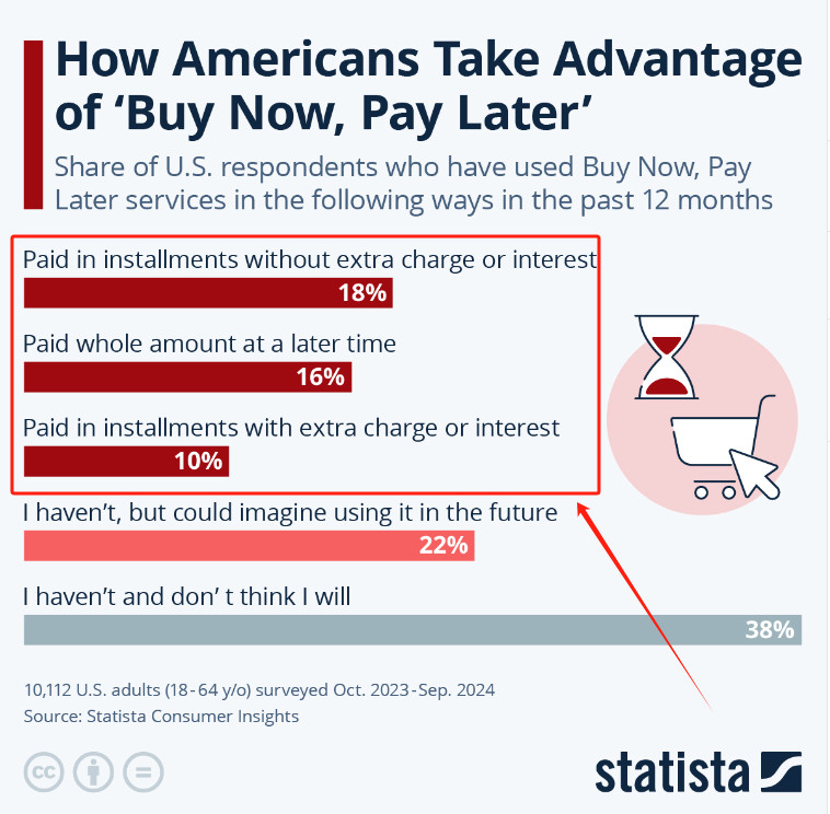 “先买后付”(Buy Now, Pay Later,简称BNPL)模式迅速崛起,从社交媒体购物到线下零售支付,这种模式正在改变消费者的购物习惯。根据Statista数据显示,过去一年中,有 41% 的美国成年人使用过先买后付服务,22% 的人计划在未来尝试。这种新兴支付模式,正在引发全球市场的深远影响。