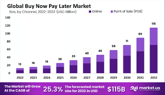 根据Market.us的数据,2023年,BNPL市场的全球规模预计为 160亿美元,并将以 25.5% 的年复合增长率持续增长,预计到2032年达到 1150亿美元。