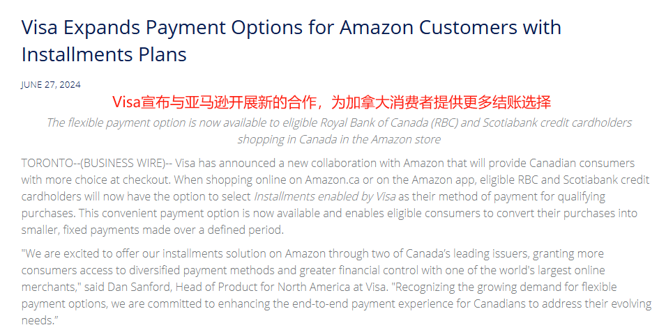 亚马逊与Visa合作推出分期付款 图源:Visa