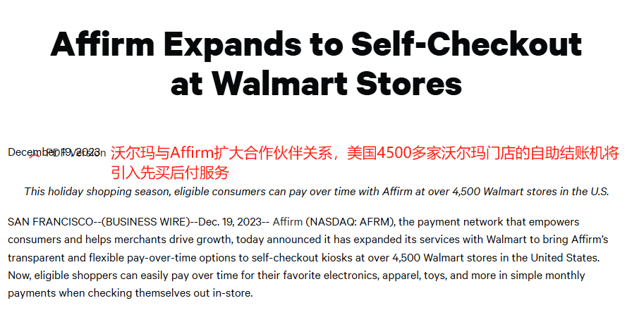 沃尔玛也在加速跟进这一趋势。去年底,沃尔玛扩大了与Affirm的合作,将先买后付服务引入全美4500多家门店的自助结账机。消费者在购物时,可以选择按月分期支付,缓解高价值商品带来的资金压力。沃尔玛的布局实现了线上线下双覆盖,进一步强化了其零售竞争力。