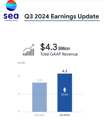 根据最新的财报数据,Shopee的表现相当亮眼。在今年第三季度,Shopee的总营收达到了31.4亿美元,成为Sea公司最大的营收来源。同时,Shopee的GMV(总交易额)同比增长了25.2%,达到了251亿美元,调整后的核心利润也为3440万美元,相较去年同期的亏损3.47亿美元,增长势头异常强劲。