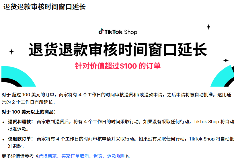 最后,TikTok Shop还对退货退款的审核时间进行了延长。商家将在更长的时间窗口内处理退货并完成退款,这无疑为商家提供了更大的灵活性,尤其是在高峰期可以避免过于匆忙地处理每一个退货。虽然延长审核时间有助于缓解压力,但商家同样要注意及时处理退款请求,以避免因延误产生负面评价。
