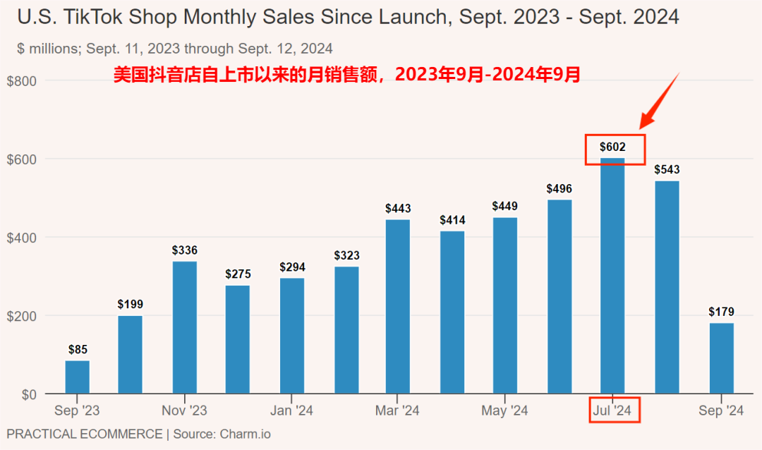 TikTok Shop的增长曲线极具吸引力。从2023年9月至2024年9月,美国市场的月销售额呈现稳步上升趋势。特别是在2024年7月,平台单月收入突破6亿美元,创造了历史新高。全年销售数据显示,TikTok Shop已成为美国社交电商领域的重要参与者。