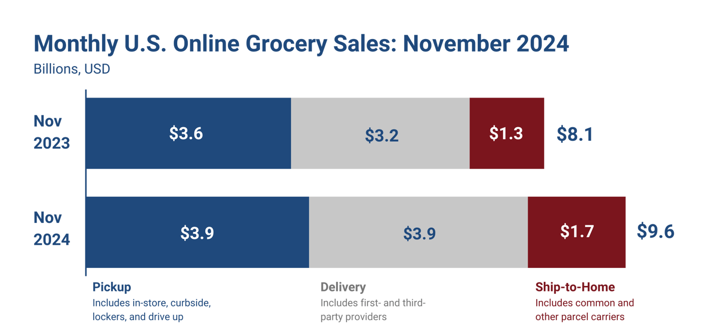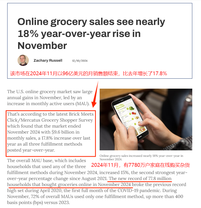 根据最新的数据,2024年11月,美国在线杂货市场的销售额同比增长了17.8%,月销售额达到了惊人的96亿美元。这不仅是一个庞大的数字,它还反映了越来越多消费者对在线购物的偏好和依赖。