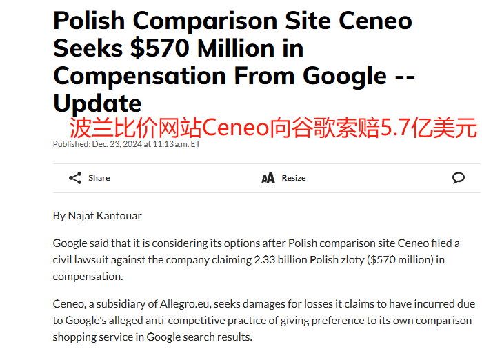 这不是小打小闹。Ceneo在诉讼中明确提出,谷歌的不正当竞争行为导致了其从2013年至2024年11月期间的直接经济损失高达17.2亿兹罗提,另加6.15亿兹罗提的利息。除此之外,Ceneo还计划对这笔高达23.3亿兹罗提的索赔金额加收法定利息,直到谷歌支付完毕。