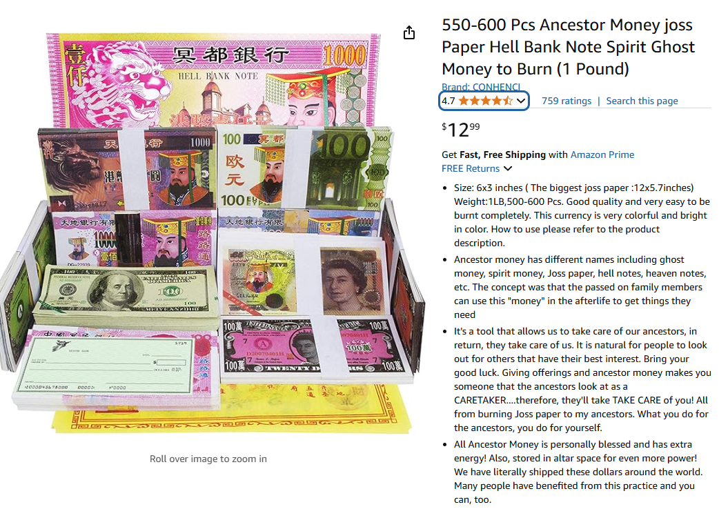 数据显示,这类产品最近在海外搜索量暴涨1800%,订单数增长135%,甚至价格翻了几十倍——国内一包冥币只需几元,在亚马逊上竟能卖到12.99美元!