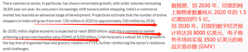 印度电商市场蓬勃发展,预计到2025年底,电商市场估值将达77.7亿美元,订单量同比增长36.8%。而到2030年时,电商商品交易总额(GMV)预计将增长到3500亿美元。