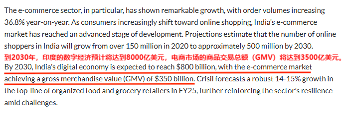 你可以想象一下,印度目前的电商市场相较于西方市场的成熟程度,依然有很多增长空间。尤其是在二三线城市,随着互联网覆盖率的提升,越来越多的消费者开始加入电商购物的队伍。到2030年,印度电商购物者的数量预计将从2020年的1.5亿增长到5亿。换句话说,印度的电商市场将迎来一个井喷期,潜力巨大。