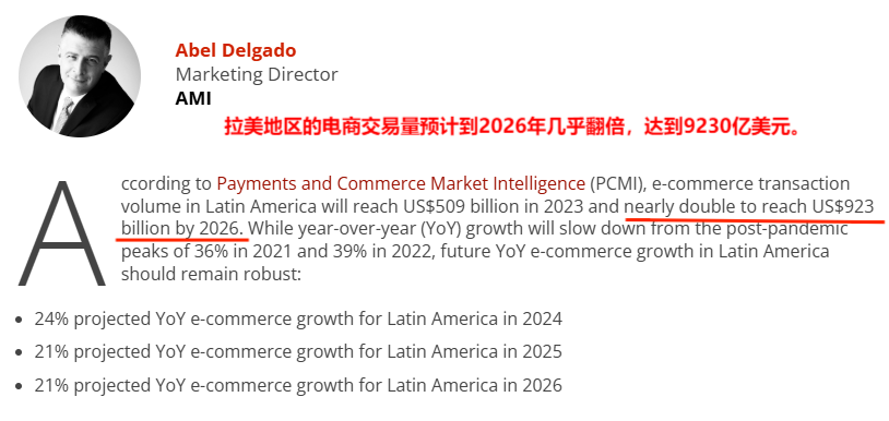 如果你觉得东南亚已经很热,那么拉美市场的增速简直可以用“全球第一”来形容。根据预测,拉美电商市场将在2026年达到9230亿美元,未来三年内,年均增长率将超过20%。这一增速在全球范围内都是非常罕见的。