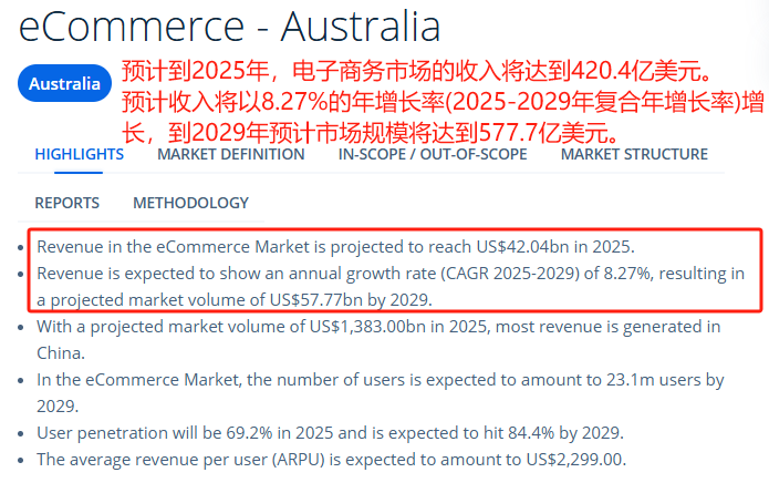 根据Statista的数据,到2025年,澳洲电商市场规模预计将达到422.2亿美元,并将在2029年扩大至580.3亿美元,年均增长率维持在8%左右。虽然增速不像东南亚、拉美市场那么猛,但胜在稳定,而且澳洲消费者的购买力普遍较高,市场空间仍然很大。