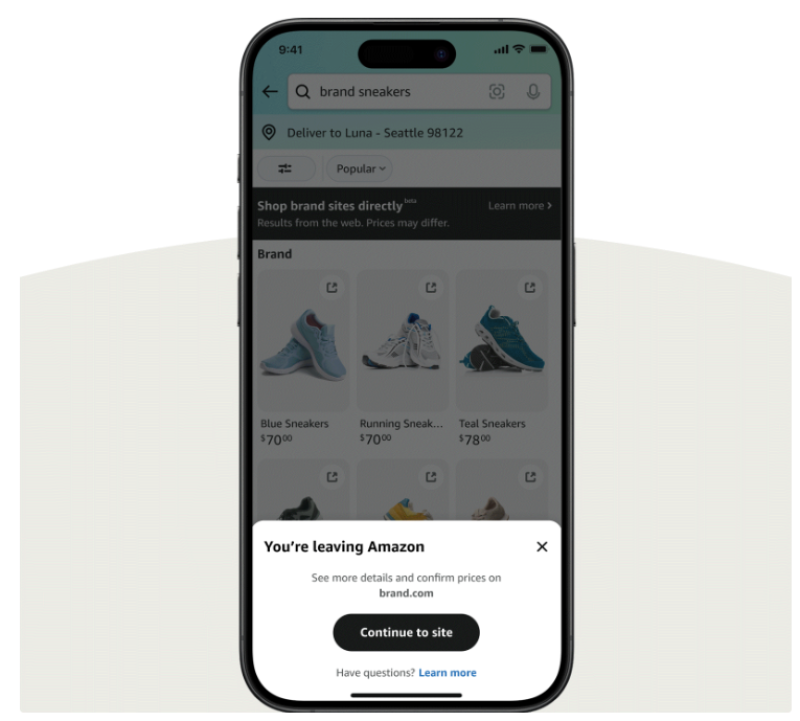 根据亚马逊官方消息,当用户在亚马逊App内搜索某个品牌或商品时,搜索结果将分为两类:一是亚马逊平台内可购买的商品,二是未在亚马逊销售但能在品牌官网买到的商品。用户点击“查看更多”后,会收到跳转至品牌独立站的提示,确认后即可完成站外购买。