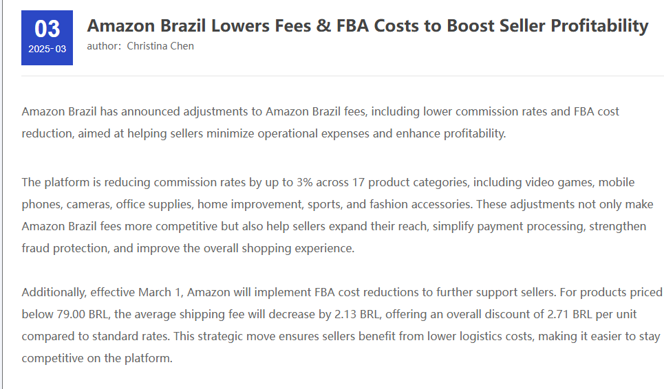 2024年2月,亚马逊巴西站接连出台两项关键政策:针对手机、家居、服装等17个核心类目实施最高3%的佣金下调,同时对价值低于79雷亚尔(约合110元人民币)的商品降低FBA物流费用。这两项措施直接降低卖家综合运营成本约5%,标志着亚马逊在巴西市场的战略升级。据官方披露,新政策将覆盖平台7.8万名卖家,涉及1840万件商品。