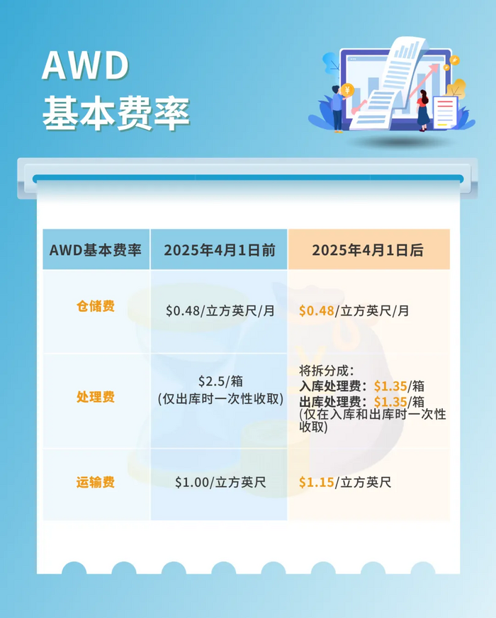 从2025年4月1日起,亚马逊仓配服务(AWD)的基础费率中,仓储费还是每月每立方英尺0.48美元,但运输费涨到了每立方英尺1.15美元。最扎心的是处理费,原本统一收费现在拆成了入库和出库两笔,每箱各收1.35美元。举个例子,如果你一个月处理100箱货,光这两项就得掏270美元,比过去多花一倍。
