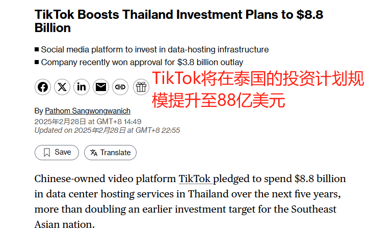 TikTok宣布在泰国投资88亿美元 图源:bloomberg