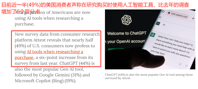 消费者研究机构Attest近期发布的一组数据揭示了这场静悄悄的革命,49%的美国消费者在购物时会使用人工智能工具辅助决策,比一年前增长了6个百分点。