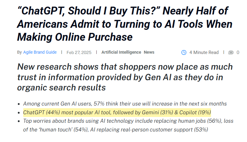 数据显示,ChatGPT以44%的使用率稳居购物类AI工具榜首,Google Gemini(31%)和微软Copilot(19%)紧随其后。这种转变的背后,是消费者对购物效率的极致追求。以往需要花费几小时对比参数、查阅评价的决策过程,现在只需向AI描述需求即可完成。