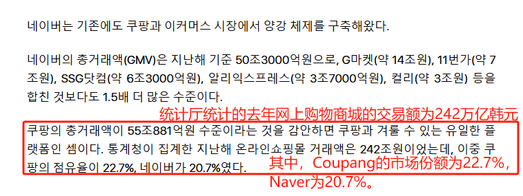去年韩国电商市场规模冲到242万亿韩元,Coupang和Naver分别吃掉22.7%和20.7%的份额。别看只差2个百分点,放在万亿大盘里就是近5万亿韩元的差距。