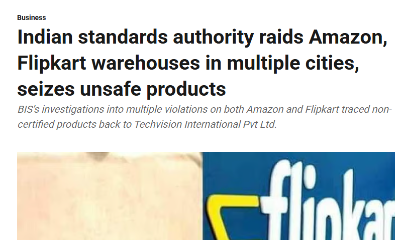 近期,印度标准局(BIS)对亚马逊、Flipkart等电商巨头的仓库展开突击检查,范围覆盖德里、古尔冈、勒克瑙等城市,查获大量未通过强制性认证的商品。例如,亚马逊勒克瑙仓库中215件玩具、24台手持搅拌机因缺乏BIS认证被扣押;古尔冈仓库则发现铝箔、金属水瓶、PVC电缆等不合规商品。Flipkart的关联仓库中,534个真空隔热瓶、134个玩具和41个扬声器同样因认证缺失被查抄。
