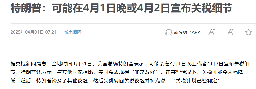 根据最新消息,美国总统特朗普将于当地时间4月2日下午4点(北京时间次日凌晨4点)正式签署行政令,新关税将在宣布后“立即生效”。