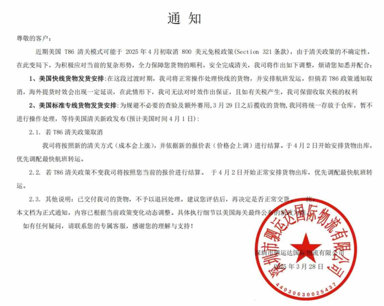 深圳市驷运达国际物流已发布通知,宣布暂停处理美国标准专线货物,并将3月29日后揽收的包裹暂存仓库,待今日政策明确后安排转运。该公司明确表示,若T86取消,将采用成本更高的清关方式,并依据新报价表结算运费。