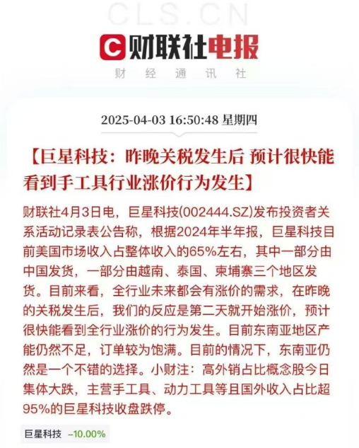 巨星科技直接“硬刚”:新政次日宣布全线涨价,管理层直言“全行业很快跟进”。
