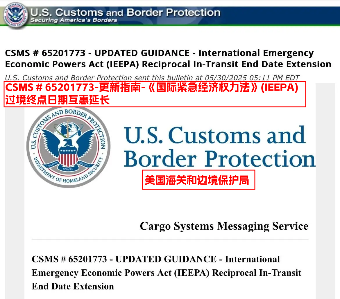 美国海关和边境保护局(CBP)于当地时间5月30日发布CSMS # 65201773更新指南,延长《国际紧急经济权利法》(IEEPA)。