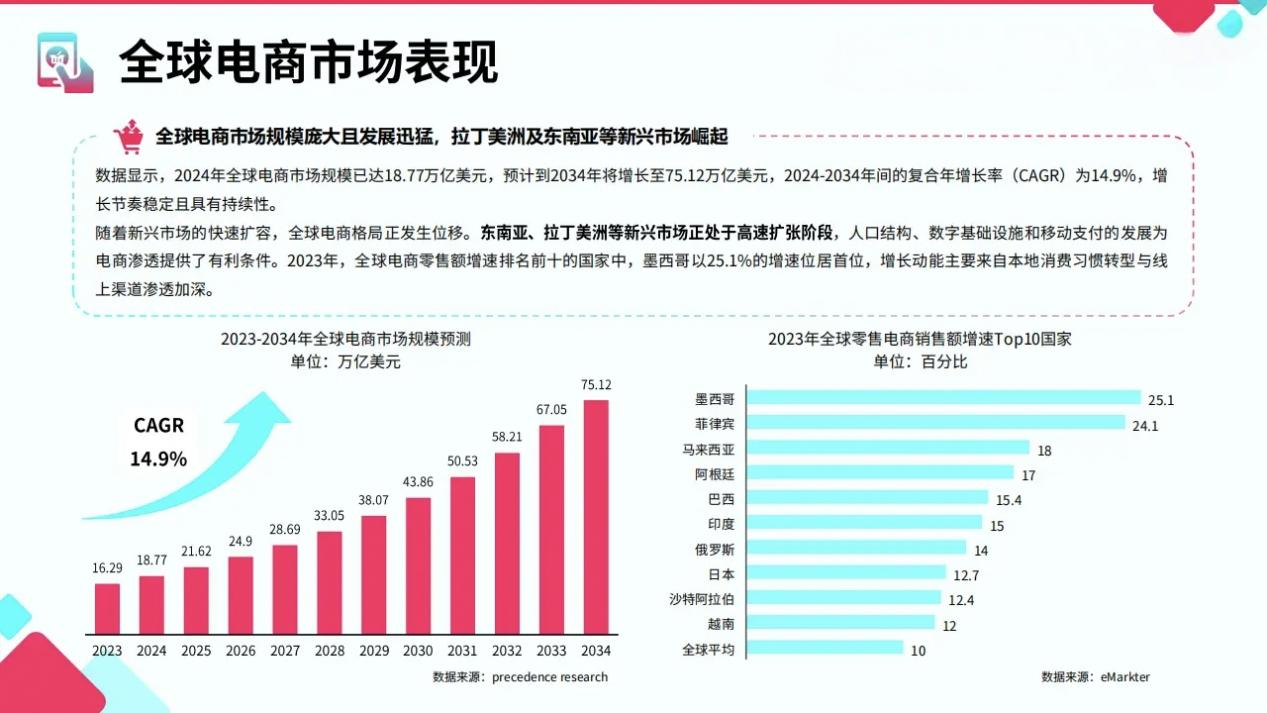 据precedence research数据显示,2024年全球电商市场规模将达18.77万亿美元,预计到2034年增长至75.12万亿美元,未来十年复合年均增长率(CAGR)达14.9%。相比北美与欧洲的增速趋缓,新一轮增长更集中于拉丁美洲、东南亚等新兴市场。