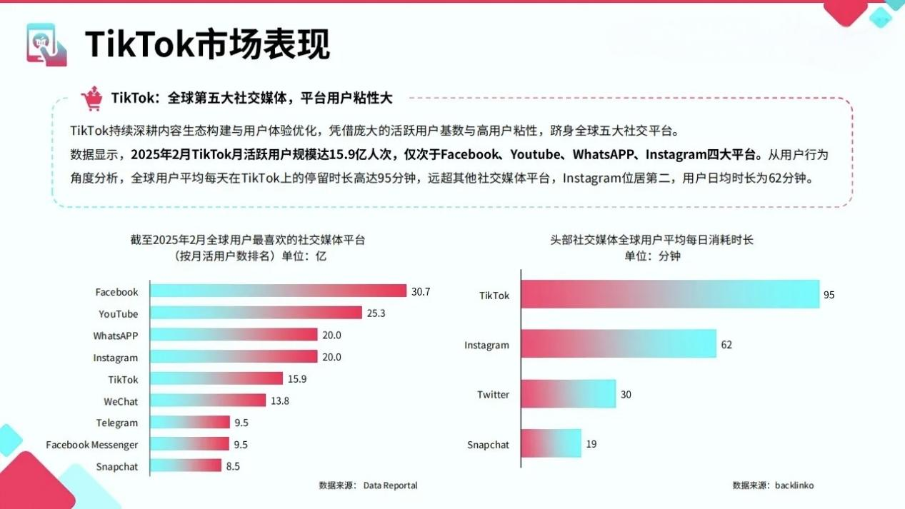 根据Data Reportal与Backlinko数据,截至2025年2月,TikTok全球月活用户已达15.9亿人次,位列全球第五大社交平台;用户每日平均停留时长达95分钟,远超Instagram(62分钟)与Twitter(30分钟)。