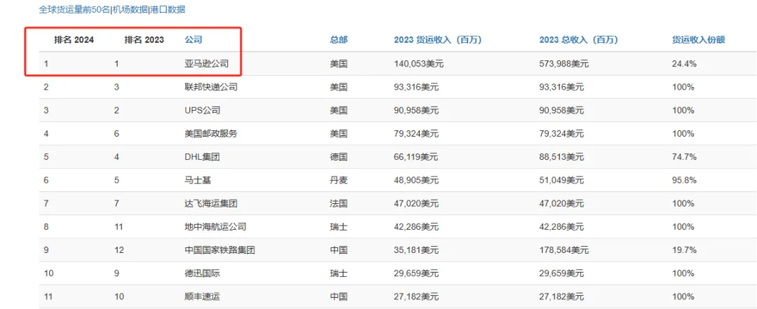 然而,物流巨头的竞争版图正在被改写。依托长期积累的庞大基础设施和完善的物流体系,电商巨头亚马逊已强势崛起为一股不可忽视的力量。根据Transport Topics发布的《全球货运企业50强榜单》,亚马逊在2023年和2024年连续两年超越UPS、FedEx、DHL等传统物流巨头,登顶全球最大货运公司宝座。