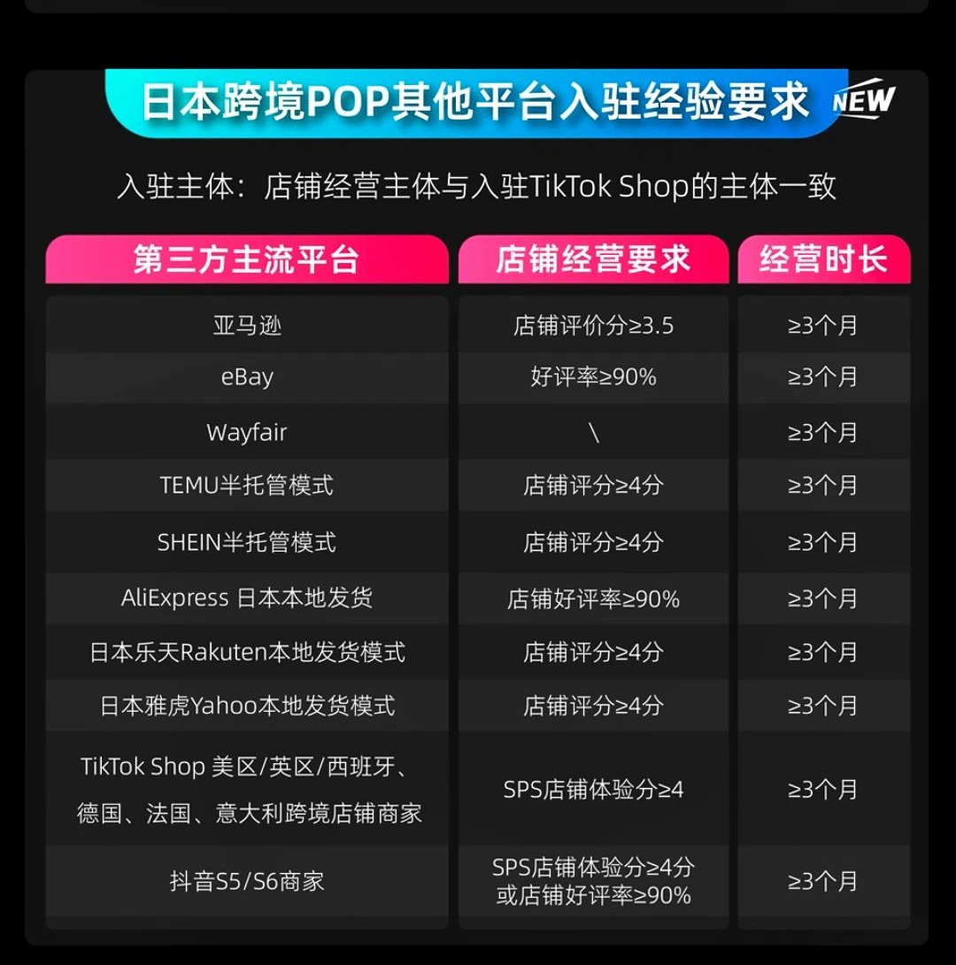 平台高度青睐拥有亚马逊、eBay、日本乐天、日本雅虎、抖音S5/S6级店铺等主流平台成功运营经验的实力卖家。同一主体凭其在其他平台的运营资质(目前已覆盖超10个平台),可便捷入驻TikTokShop日本站。