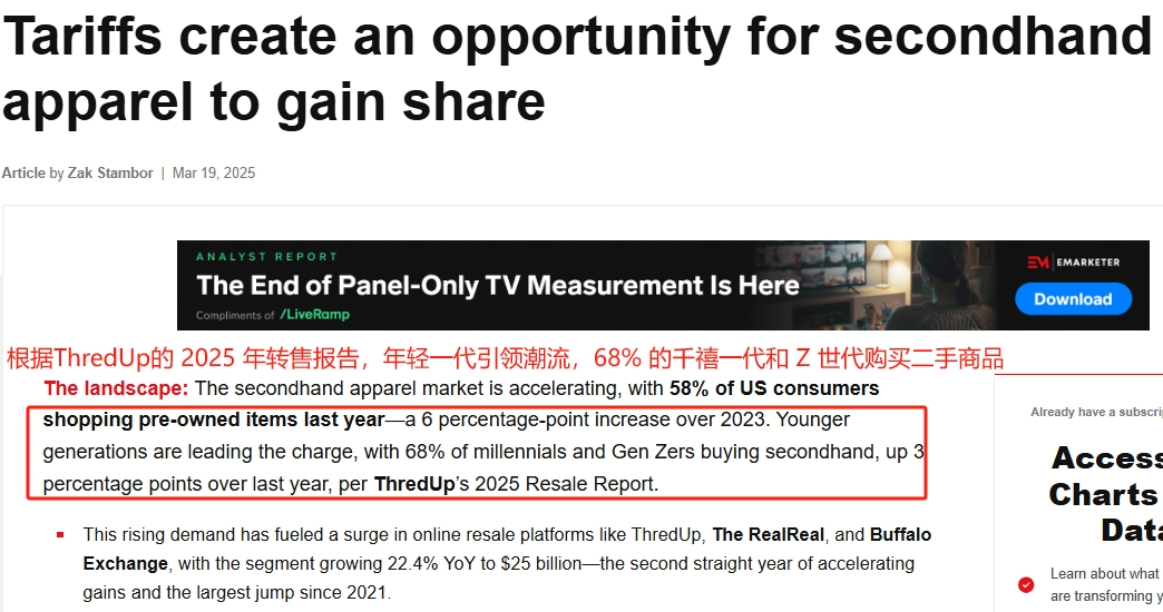 在波动的关税政策影响下,进口家具、电子产品、电器等商品价格飙升。为了应对价格上涨,寻求更实惠的购物方式,大量美国千禧一代和Z世代消费者将目光转向了二手市场。