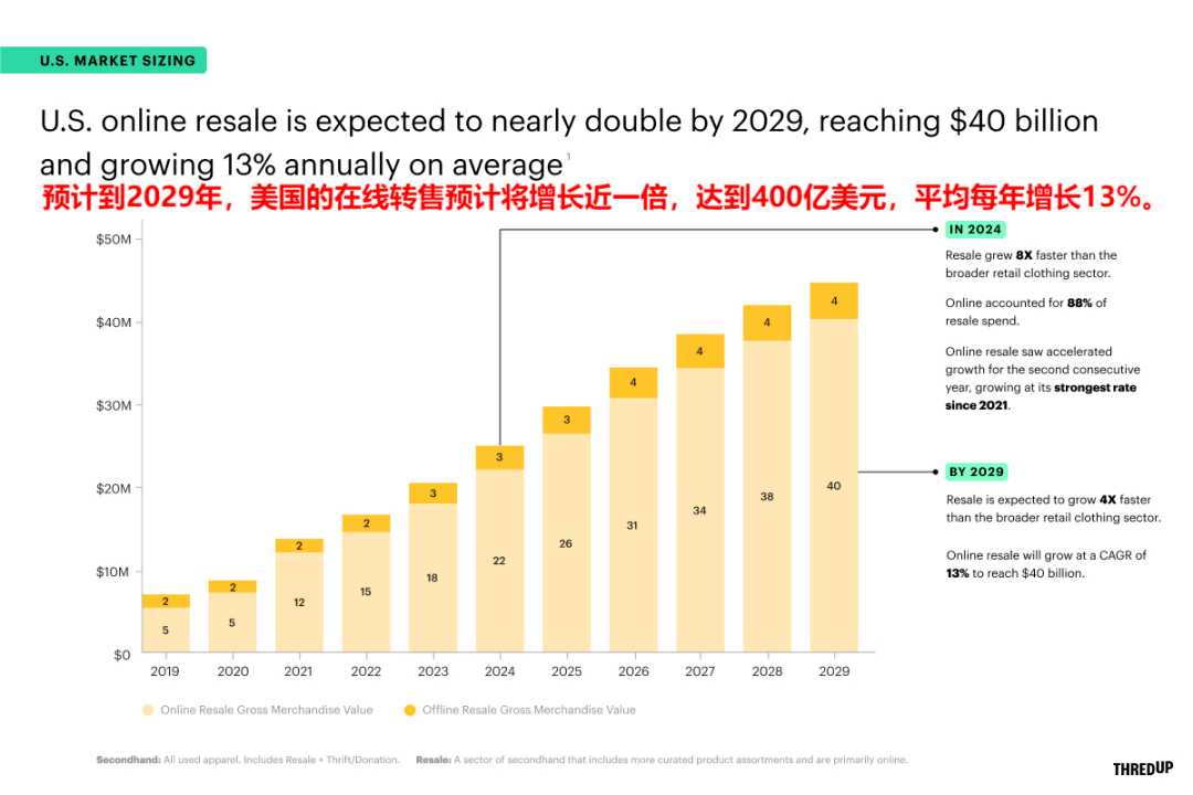 展望未来,增长势头依然强劲。报告预测,按照当前趋势,2025年美国在线二手服装市值将进一步攀升至260亿美元。更长远地看,未来5年内该市场规模预计将增长近一倍,到2029年有望达到约400亿美元。